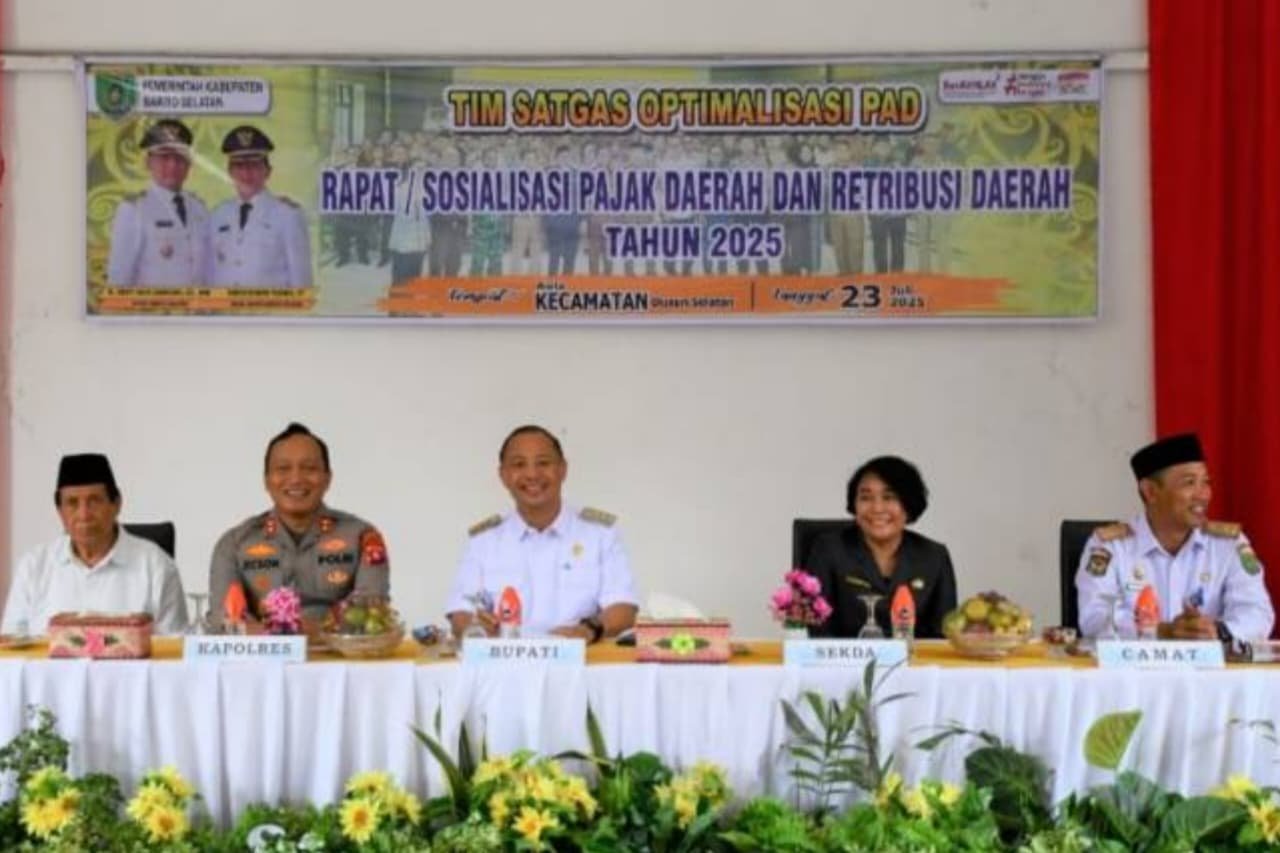 Bupati Barito Selatan (Barsel) Eddy Raya Samsuri membuka kegiatan Sosialisasi Pajak dan Retribusi Daerah Tahun 2025 di Aula Kantor Kecamatan Dusun Selatan, Rabu (23/7/2025).