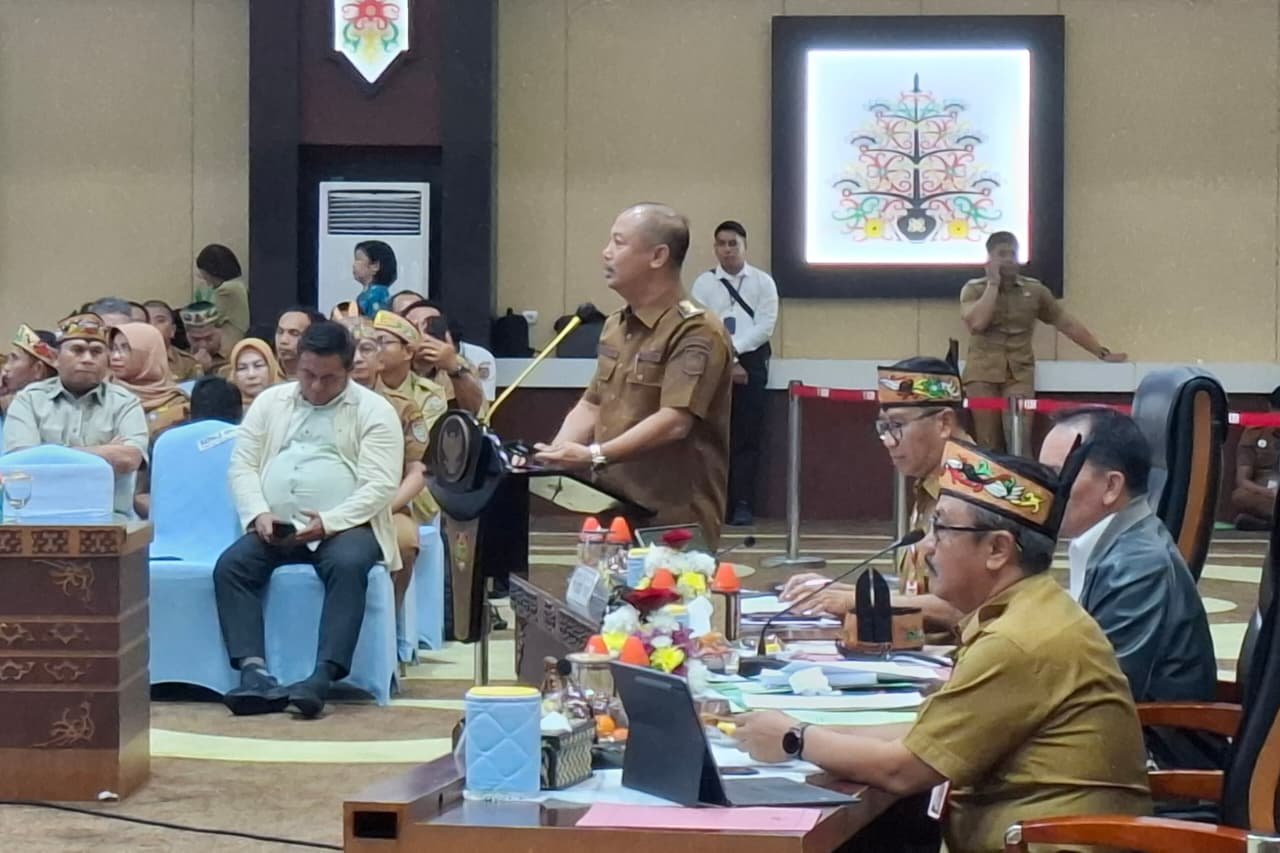 Bupati Kabupaten Barito Selatan, Eddy Raya Samsuri saat menyampaikan Laporan pada Kegiatan Rapat Koordinasi PAD Sektor Perkebunan dan Kehutanan Kalteng di Aula Jayang Tingang, Kantor Gubernur Kalimantan Tengah, Palangka Raya, Senin (20/10/2025).
