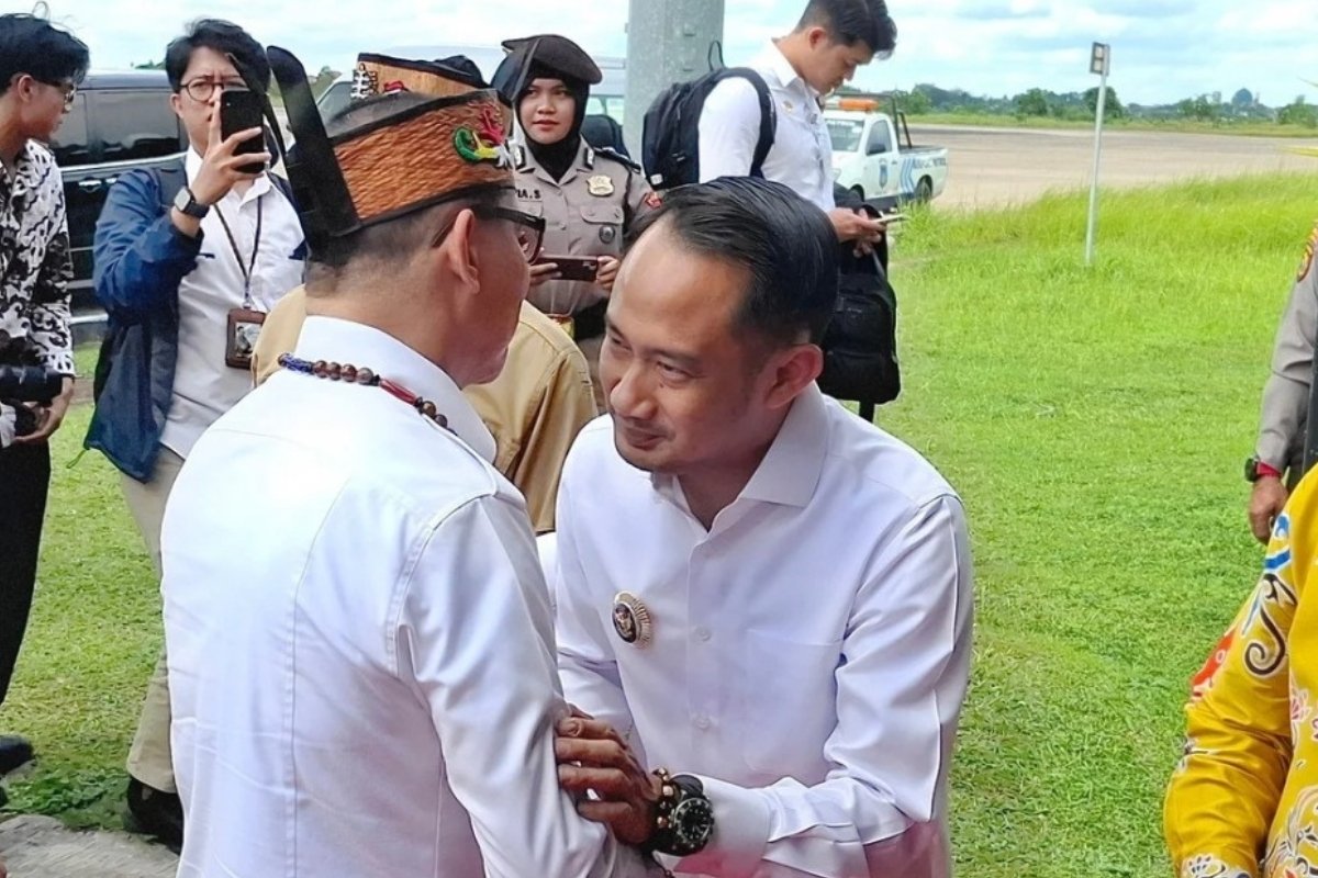 Wali Kota Palangka Raya, Fairid Naparin saat menyambut kedatangan Menteri Pelindungan Pekerja Migran Indonesia (P2MI), Mukhtarudin di Bandara Tjilik Riwut, Palangka Raya, Kamis (27/11/2025).