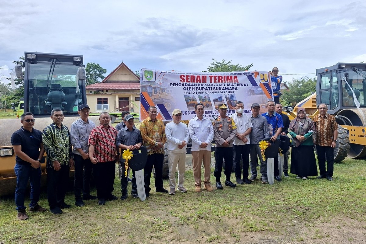 Pemerintah Kabupaten Sukamara menyerahkan unit alat berat berupa tiga unit vibro dan tiga unit grader untuk mendukung pembangunan dan pemeliharaan infrastruktur jalan di tiga daerah. Serah terima alat berat tersebut berlangsung di halaman Kantor Dinas PUPR-PRKP Sukamara, Jumat (26/12/25).
