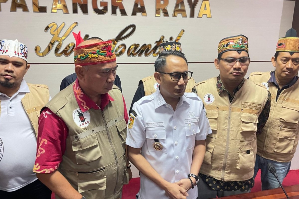 Wali Kota Palangka Raya Fairid Naparin memberikan keterangan usai menerima audiensi Gerakan Dayak Anti Narkoba (GDAN) terkait peredaran narkoba di Kawasan Puntun di Aula Kantor Pemerintah Kota Palangka Raya, Kamis (8/1/2026), didampingi Ketua Umum GDAN dan jajaran pengurus. FOTO: MEDIA CENTER PALANGKA RAYA